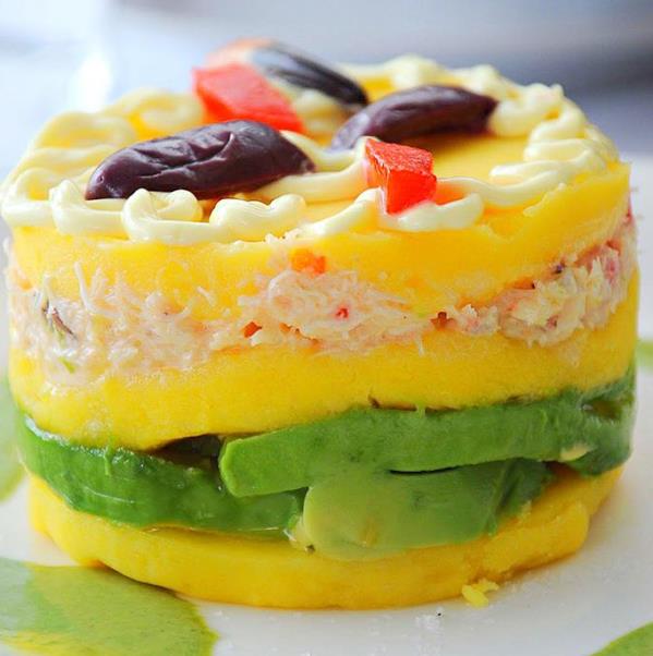 La Causa Limeña es un plato típico de la gastronomía peruana que consiste en una especie de pastel de papa amarilla con un relleno de pollo, atún o mariscos. Es un plato muy versátil y sabroso, ideal para disfrutar como entrada o plato principal. La textura suave y cremosa de la papa se combina perfectamente con el sabor del relleno y los aderezos.